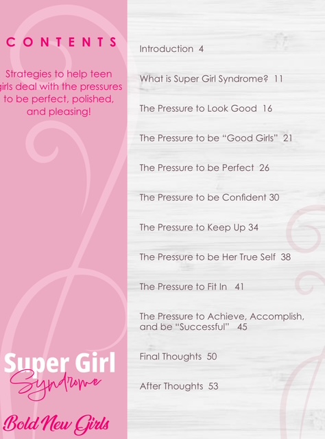 But, don’t worry! I am here to help you. So let’s explore and 8 pressures teen girls are feeling when it comes to Super Girl Syndrome and the strategies and steps you can take to help her through. In this e-book, we will explore: